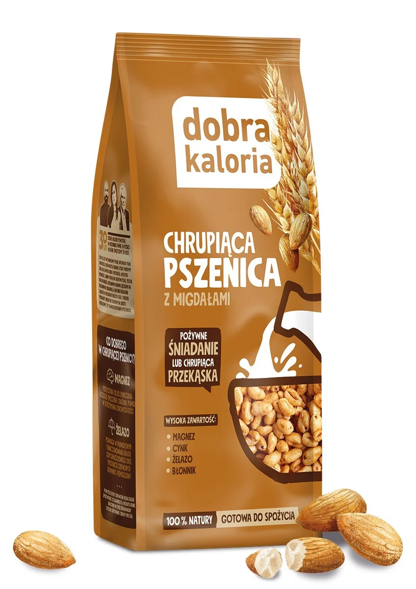 Pyszne i słodkie połączenie migdałow, miodu i ekspandowanych ziaren pszenicy — lekkie, chrupiące i pełne błonnika, który dba o prawidłową pracę jelit i pomaga utrzymać uczucie sytości na długo. Pszenica to także cenne źródło żelaza i magnezu, minerałów niezbędnych do produkcji energii, wsparcia układu nerwowego i poprawy koncentracji. Dodaliśmy także migdały— pełne zdrowych tłuszczów, białka oraz witamin z grupy B i E, które wspierają kondycję skóry, włosów i układu odpornościowego. Migdały dodają chrupiącej przekąsce wyjątkowego smaku i wartości odżywczych, dzięki czemu każda łyżka to mała porcja dobroci.